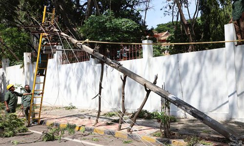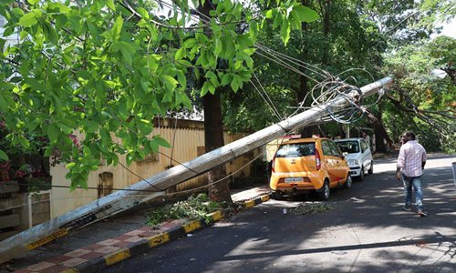 A fallen utility pole is seen in a street after the heavy rainfall and thunderstorms in Bangalore, India, on May 27, 2019. (Xinhua/Stringer)
