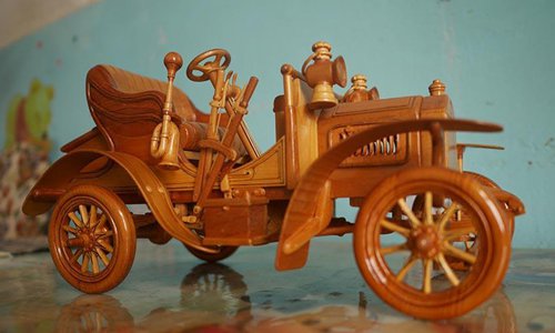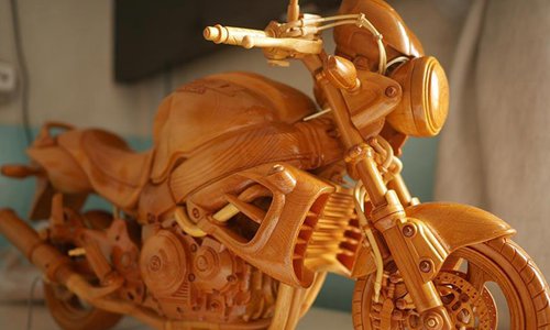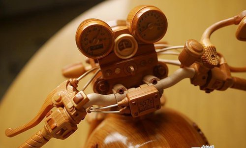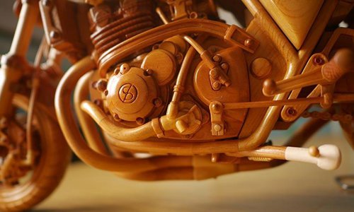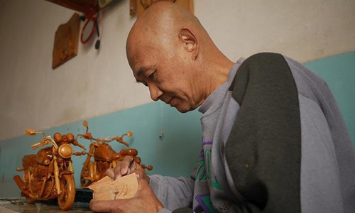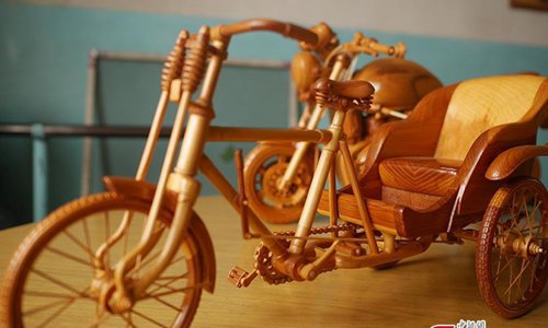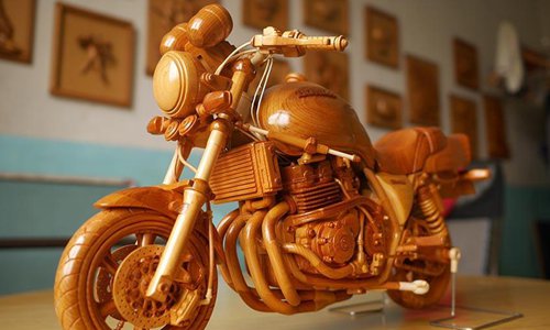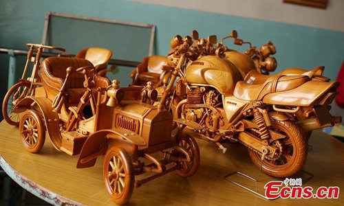 Chuai Mege shows his hand-made miniature motorcycles carved out of wood in Jilin City, Jilin Province. A former automobile mechanic, the 66-year-old man has been fascinated with making miniature motorcycles for 24 years. He said he usually needs a whole year to complete the making a miniature motorcycle because of his attention to detail and quality. For example, he needs to carve over 700 motorcycle parts including tires, the dashboard, and even screws. (Photo: China News Service/Cang Yan)
