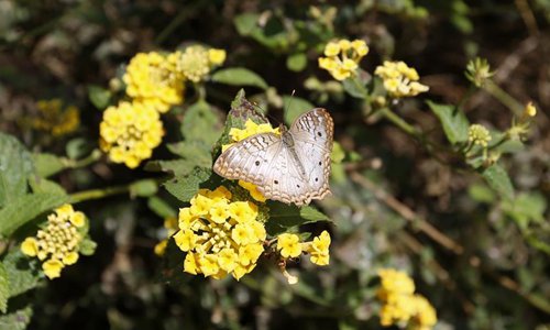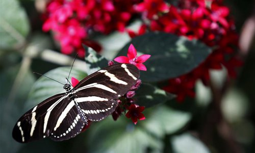 A butterfly rests on flowers at the Butterfly Pavilion of the Natural History Museum of Los Angeles County in Los Angeles, the United States, May 27, 2019. The butterfly exhibition at the Natural History Museum of Los Angeles County showcases hundreds of butterflies and the plants that surround them. (Xinhua/Li Ying)