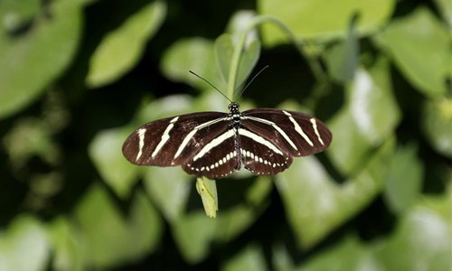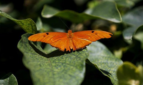 A butterfly is seen on leaves at the Butterfly Pavilion of the Natural History Museum of Los Angeles County in Los Angeles, the United States, May 27, 2019. The butterfly exhibition at the Natural History Museum of Los Angeles County showcases hundreds of butterflies and the plants that surround them. (Xinhua/Li Ying)