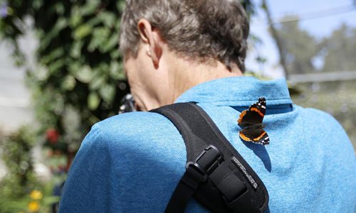 A butterfly rests on a photographer at the Butterfly Pavilion of the Natural History Museum of Los Angeles County in Los Angeles, the United States, May 27, 2019. The butterfly exhibition at the Natural History Museum of Los Angeles County showcases hundreds of butterflies and the plants that surround them. (Xinhua/Li Ying)