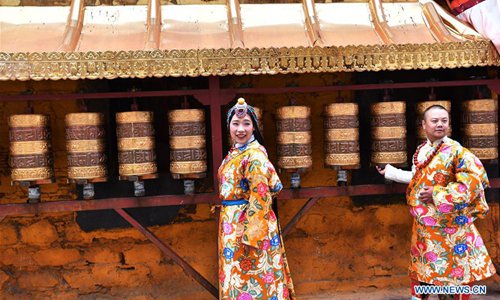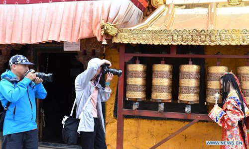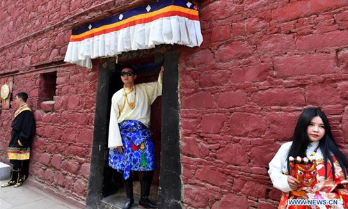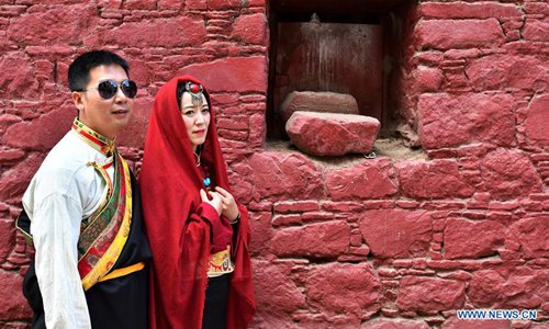 A tourist poses for photos in traditional Tibetan costume in the old town of Lhasa, capital city of southwest China's Tibet Autonomous Region, May 28, 2019. Many tourists here choose to have a picture taken as a souvenir while wearing beautiful Tibetan costumes. (Xinhua/Chogo)