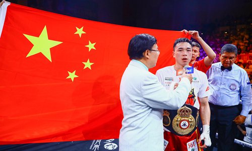 Chinese boxer Xu Can celebrates victory over Japan's Shun Kubo on Sunday in Fuzhou, East China's Jiangxi Province. Photo: Courtesy of M23 boxing club
