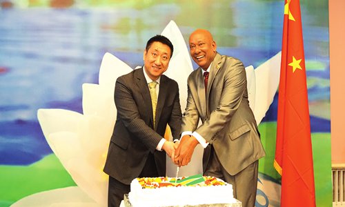 The Guyanese Ambassador to China Bayney Karran (right)and Han Jing cut a ceremonial cake. Photo: Yin Yeping/GT