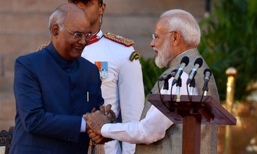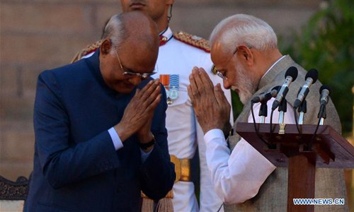 Indian President Ram Nath Kovind (L) greets Narendra Modi during a swearing-in ceremony at the Presidential Palace in New Delhi, India, May 30, 2019. Narendra Modi was sworn in for a second term as the country's prime minister on Thursday. (Xinhua)