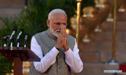 Indian Prime Minister Narendra Modi gestures towards supporters after taking oath during a swearing-in ceremony at the Presidential Palace in New Delhi, India, May 30, 2019. Narendra Modi was sworn in for a second term as the country's prime minister on Thursday. (Xinhua)