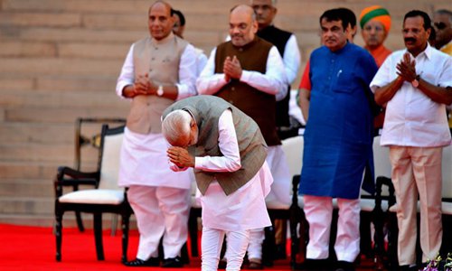 Indian Prime Minister Narendra Modi (front) gestures towards supporters after taking oath during a swearing-in ceremony at the Presidential Palace in New Delhi, India, May 30, 2019. Narendra Modi was sworn in for a second term as the country's prime minister on Thursday. (Xinhua)