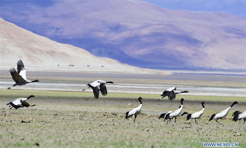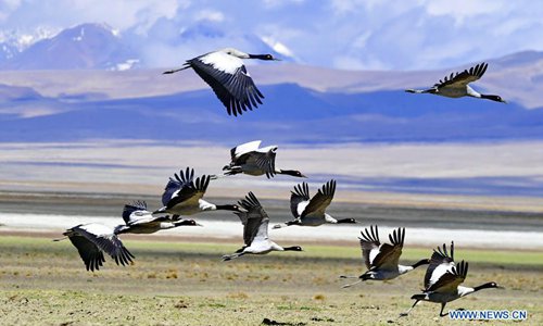 Black-necked cranes fly over the in Doqen Co (Lake) Yadong County, southwest China's Tibet Autonomous Region, May 29, 2019. (Xinhua/Zhang Rufeng)
