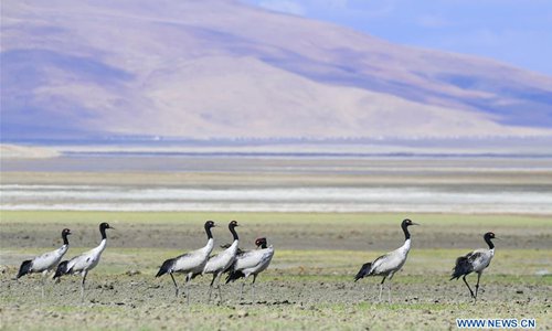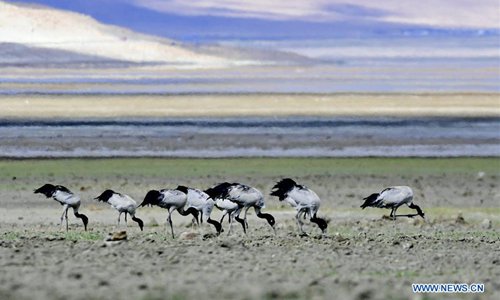 Black-necked cranes forage on the Doqen Co (Lake) in Yadong County, southwest China's Tibet Autonomous Region, May 29, 2019. (Xinhua/Zhang Rufeng)