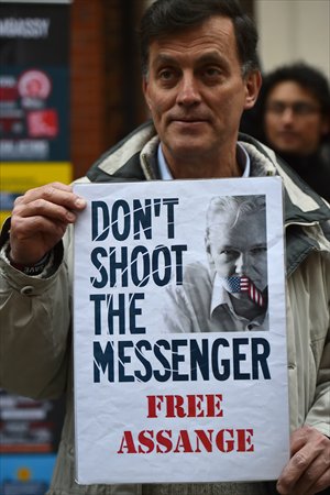 A supporter holds a placard reading "Don't shoot the messenger - free Assange" during a vigil held for WikiLeaks founder Julian Assange outside the Ecuadorian Embassy in London. Photo: AFP