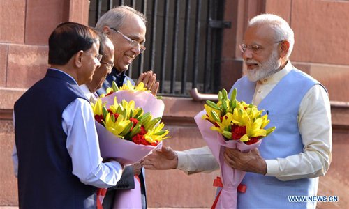 Indian Prime Minster Narendra Modi receives flowers from senior government officials as he arrives to chair a meeting of the newly formed cabinet in New Delhi, May 31, 2019. (Photo: Xinhua)