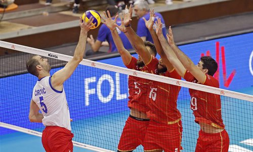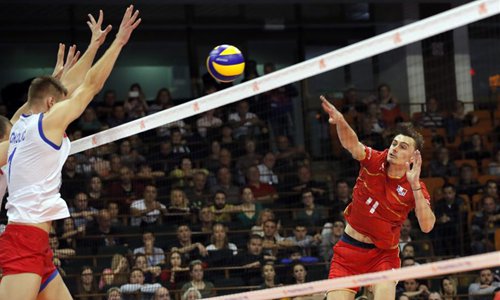 Serbia's Lazar Cirovic (L) spikes during Volleyball Nations League match between France and Serbia in Novi Sad, Serbia, on June 1, 2019. France won 3-1. (Xinhua/Predrag Milosavljevic)