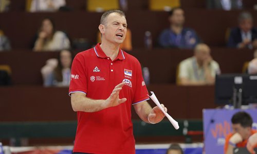 Serbia's head coach Nikola Grbic gestures during Volleyball Nations League match between France and Serbia in Novi Sad, Serbia, on June 1, 2019. France won 3-1. (Xinhua/Predrag Milosavljevic)