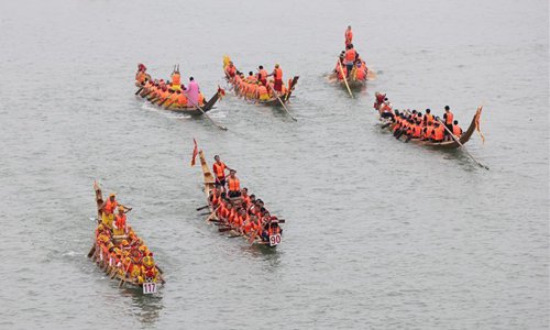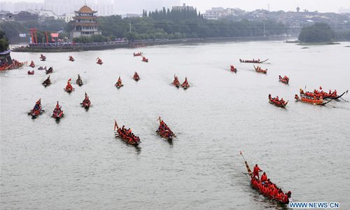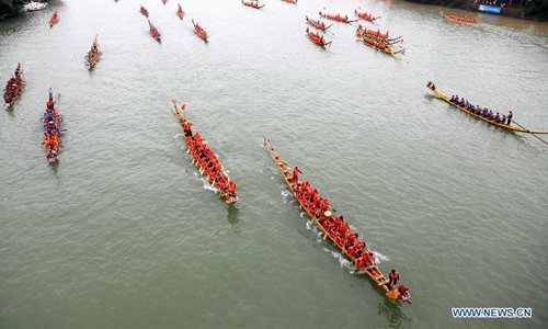 Competitors take part in a dragon boat race held on the Xiaoshui River to celebrate the upcoming Dragon Boat Festival in Daoxian County of Yongzhou, central China's Hunan Province, June 1, 2019. (Photo: Xinhu)