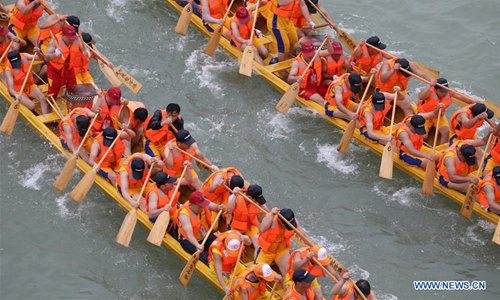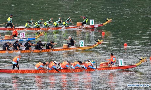 Competitors take part in a dragon boat race held on the Yinghu Lake to celebrate the upcoming Dragon Boat Festival in Ankang City, northwest China's Shaanxi Province, June 1, 2019. (Photo: Xinhu)