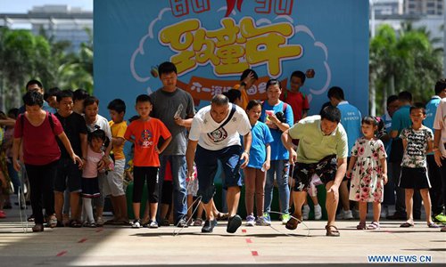 People participate in a loop-rolling game at Hainan Museum in Haikou, capital of south China's Hainan Province, June 1, 2019. A special event featuring "old games" including playing glass balls and hopscotch is held on Saturday to celebrate the International Children's Day. (Xinhua/Guo Cheng)