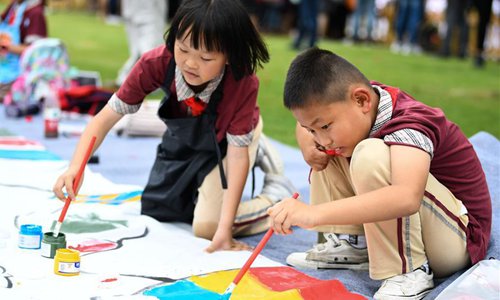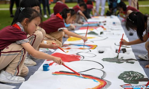 Children work on a painting at Huitong Village of Jinding Township in Zhuhai City, south China's Guangdong Province, June 1, 2019. Various activities are held across the county to celebrate the International Children's Day, which falls on Saturday. (Xinhua/Lu Hanxin)