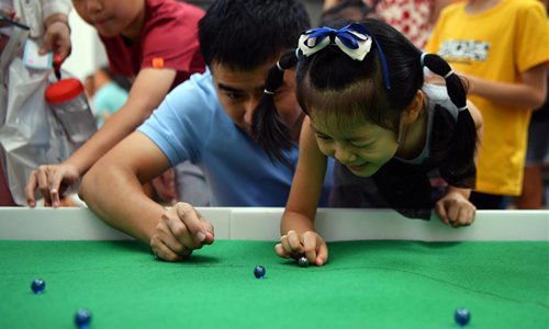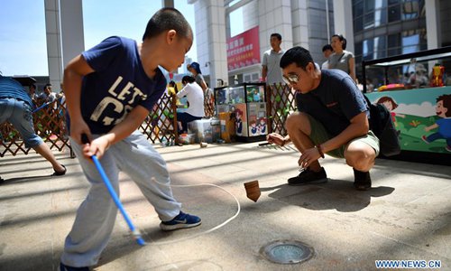 A man and his child play glass balls at Hainan Museum in Haikou, capital of south China's Hainan Province, June 1, 2019. A special event featuring "old games" including playing glass balls and hopscotch is held on Saturday to celebrate the International Children's Day. (Xinhua/Guo Cheng)