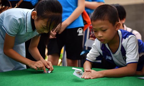 Children play picture cards at Hainan Museum in Haikou, capital of south China's Hainan Province, June 1, 2019. A special event featuring "old games" including playing glass balls and hopscotch is held on Saturday to celebrate the International Children's Day. (Xinhua/Guo Cheng)