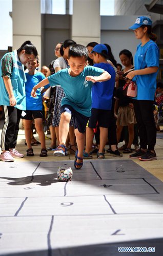 A child plays hopscotch at Hainan Museum in Haikou, capital of south China's Hainan Province, June 1, 2019. A special event featuring "old games" including playing glass balls and hopscotch is held on Saturday to celebrate the International Children's Day. (Xinhua/Guo Cheng)