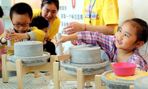 Children grind beans with a stone mill during a themed event in east China's Shanghai, June 1, 2019. Various activities are held across the county to celebrate the International Children's Day, which falls on Saturday. (Xinhua/Liu Ying)