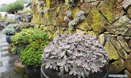 Photo taken on May 31, 2019 shows succulent plants planted at a villager's house in Shenyang village of Jingning She Autonomous County, Lishui City, east China's Zhejiang Province. The village, famous for its traditional rock houses, has developed a succulent farming industry in recent years to help boost farmers' income. (Xinhua/Li Suren)