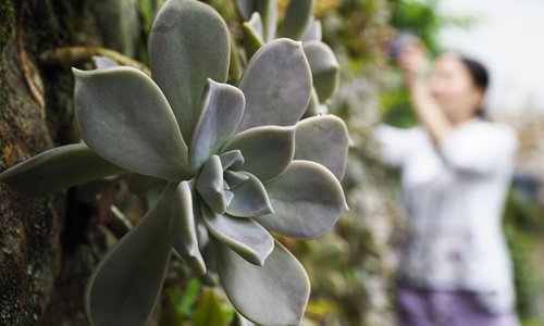 A visitor takes pictures of succulent plants in Shenyang village of Jingning She Autonomous County, Lishui City, east China's Zhejiang Province, May 31, 2019. The village, famous for its traditional rock houses, has developed a succulent farming industry in recent years to help boost farmers' income. (Xinhua/Li Suren)
