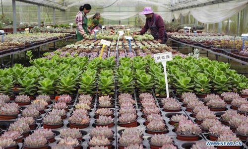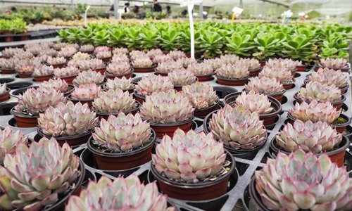 Visitors purchase succulent plants at a cultivation base in Shenyang village of Jingning She Autonomous County, Lishui City, east China's Zhejiang Province, May 31, 2019. The village, famous for its traditional rock houses, has developed a succulent farming industry in recent years to help boost farmers' income. (Xinhua/Li Suren)