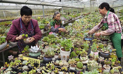 Villagers take care of succulent plants at a cultivation base in Shenyang village of Jingning She Autonomous County, Lishui City, east China's Zhejiang Province, May 31, 2019. The village, famous for its traditional rock houses, has developed a succulent farming industry in recent years to help boost farmers' income. (Xinhua/Li Suren)