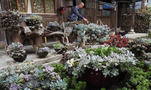 A villager takes care of succulent plants at home in Shenyang village of Jingning She Autonomous County, Lishui City, east China's Zhejiang Province, May 31, 2019. The village, famous for its traditional rock houses, has developed a succulent farming industry in recent years to help boost farmers' income. (Xinhua/Li Suren)