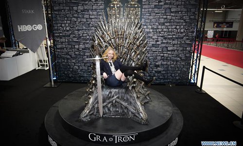 A woman poses for photos in a replica chair known from the Game of Thrones television show at the 2019 Comic Con in Warsaw, Poland on May 31, 2019. (Xinhua/Jaap Arriens)