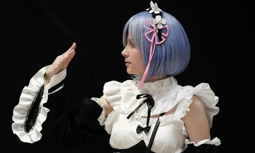 A woman dressed as a Japanese cartoon character gestures during a photo shooting at the 2019 Comic Con in Warsaw, Poland on May 31, 2019. (Xinhua/Jaap Arriens)