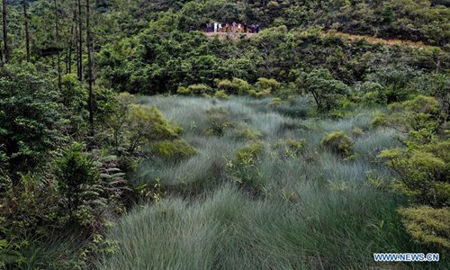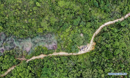Aerial photo taken on June 1, 2019 shows people enjoying scenery on the Xiangshan ancient road in Zhuhai City, south China's Guangdong Province. After several years of maintaining, the Xiangshan ancient road in Zhuhai has become a site of cultural heritage and also an exploring destination for climbers. (Xinhua/Tao Ming)