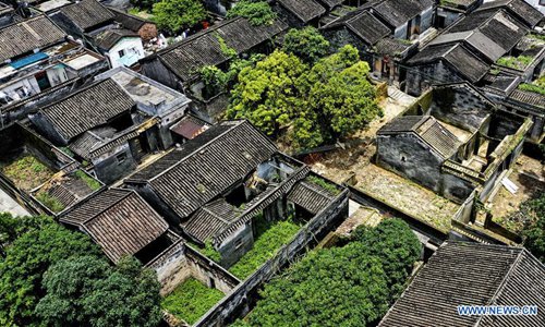 Aerial photo taken on June 1, 2019 shows a village in Tangjiawan Town near the Xiangshan ancient road in Zhuhai City, south China's Guangdong Province. After several years of maintaining, the Xiangshan ancient road in Zhuhai has become a site of cultural heritage and also an exploring destination for climbers. (Xinhua/Tao Ming)
