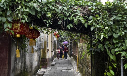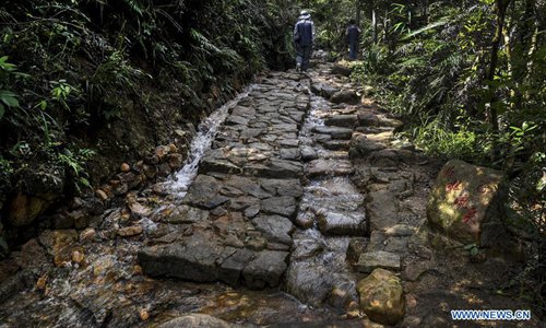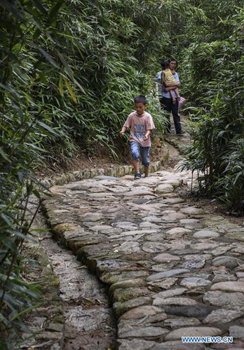 Photo taken on June 1, 2019 shows people walking on the Xiangshan ancient road in Zhuhai City, south China's Guangdong Province. After several years of maintaining, the Xiangshan ancient road in Zhuhai has become a site of cultural heritage and also an exploring destination for climbers. (Xinhua/Tao Ming)