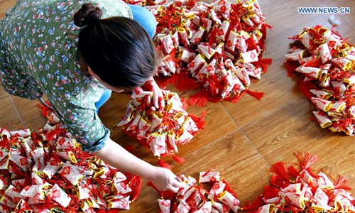 A worker arranges sachets for the upcoming Chinese traditional Duanwu Festival at a factory in Yuncheng, north China's Shanxi Province, on June 1, 2019. Duanwu Festival, also called Dragon Boat Festival, is traditionally celebrated on the fifth day of the fifth month on Chinese lunar calendar. (Xinhua/Cui Songliang)