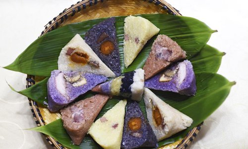 Photo taken on June 2, 2019 shows colorful Zongzi, pyramid-shaped dumplings made of glutinous rice wrapped in bamboo or reed leaves, at a factory in Taijiang County, southwest China's Guizhou Province. Different plant juices are used to color the glutinous rice when making the colorful Zongzi. Zongzi is a traditional food for the Dragon Boat Festival, which falls on June 7 this year. (Xinhua/Liu Kaifu)