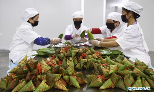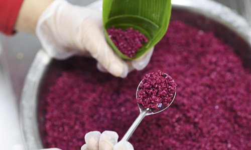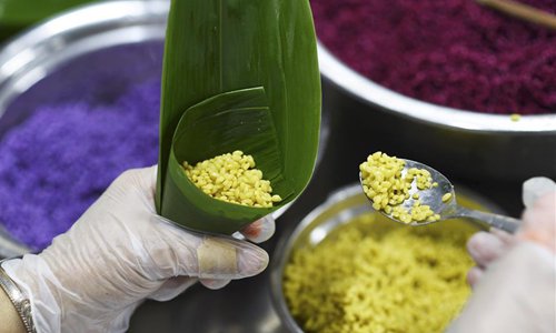 A worker makes colorful Zongzi, pyramid-shaped dumplings made of glutinous rice wrapped in bamboo or reed leaves, at a factory in Taijiang County, southwest China's Guizhou Province, June 2, 2019. Different plant juices are used to color the glutinous rice when making the colorful Zongzi. Zongzi is a traditional food for the Dragon Boat Festival, which falls on June 7 this year. (Xinhua/Liu Kaifu)