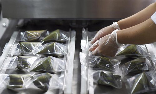 A worker packs colorful Zongzi, pyramid-shaped dumplings made of glutinous rice wrapped in bamboo or reed leaves, at a factory in Taijiang County, southwest China's Guizhou Province, June 2, 2019. Different plant juices are used to color the glutinous rice when making the colorful Zongzi. Zongzi is a traditional food for the Dragon Boat Festival, which falls on June 7 this year. (Xinhua/Liu Kaifu)