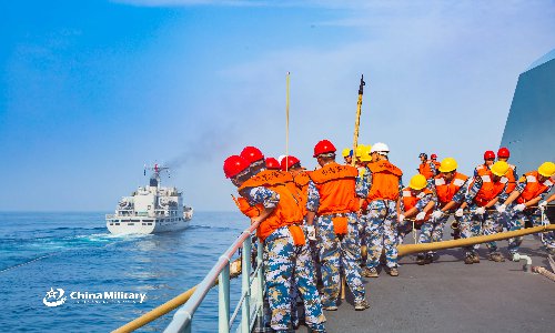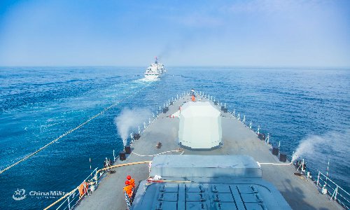 Sailors assigned to a destroyer flotilla with the navy under the PLA Southern Theater Command heave the mooring line aboard the guided-missile destroyer Shenzhen during an astern replenishment-at-sea with another vessel during a round-the-clock maritime training exercise on such subjects as live-fire operation, alongside replenishment-at-sea, ship maneuvering and so forth, in waters off the South China Sea in late May, 2019. (Photo: eng.chinamil.com.cn)