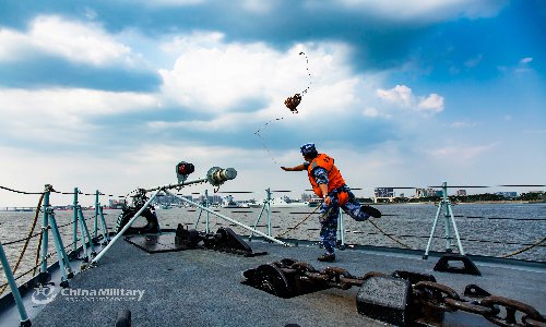 A sailor assigned to a destroyer flotilla with the navy under the PLA Southern Theater Command throws a mooring line aboard the guided-missile destroyer Shenzhen during a round-the-clock maritime training exercise on such subjects as live-fire operation, alongside replenishment-at-sea, ship maneuvering and so forth, in waters off the South China Sea in late May, 2019. (Photo: eng.chinamil.com.cn)