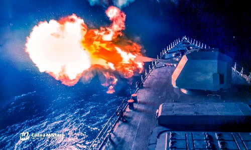 The guided-missile destroyer Shenzhen (Hull 167) attached to a destroyer flotilla with the navy under the PLA Southern Theater Command fires its main-gun at night during a round-the-clock maritime training exercise on such subjects as live-fire operation, alongside replenishment-at-sea, ship maneuvering and so forth, in waters off the South China Sea in late May, 2019. (Photo: eng.chinamil.com.cn)