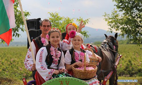 "Rose Queens" celebrate during the Rose Festival in Kazanlak, Bulgaria, June 2, 2019. The annual Rose Festival was held on Sunday in Kazanlak. Located some 200 kilometers of Bulgaria's capital Sofia, Kazanlak is a prestigious rose planting and rose oil extraction center of the country. (Photo: Xinhua)