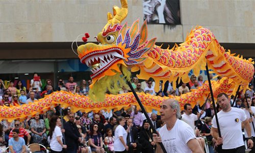 People perform dragon dance during the Rose Festival in Kazanlak, Bulgaria, June 2, 2019. The annual Rose Festival was held on Sunday in Kazanlak. Located some 200 kilometers of Bulgaria's capital Sofia, Kazanlak is a prestigious rose planting and rose oil extraction center of the country. (Photo: Xinhua)