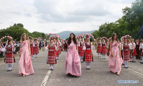 "Rose Queens" wave to people during the Rose Festival in Kazanlak, Bulgaria, June 2, 2019. The annual Rose Festival was held on Sunday in Kazanlak. Located some 200 kilometers of Bulgaria's capital Sofia, Kazanlak is a prestigious rose planting and rose oil extraction center of the country. (Photo: Xinhua)