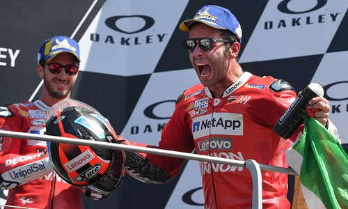 Race winner Danilo Petrucci celebrates on the podium next to third-placed Andrea Dovizioso after the Italian Moto GP Grand Prix on Saturday. Photo: VCG