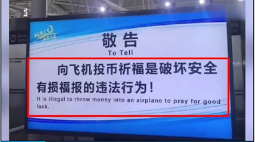 The notice board at Sanya Phoenix International Airport in South China's Hainan Province says in Chinese that "it is illegal to throw money into an airplane to pray for good luck."