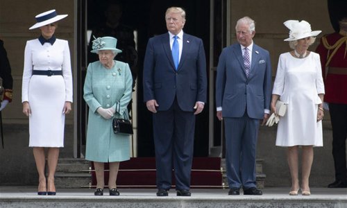 Queen Elizabeth II (2nd L), US President Donald Trump (C) and his wife Melania Trump (1st L), Prince Charles (2nd R), and Camilla, attend a welcome ceremony at Buckingham Palace in London, Britain, on June 3, 2019. U.S. President Donald Trump arrived in London on Monday to start his three-day state visit to Britain as widespread protests against him are set to take place. (Photo: Xinhua)