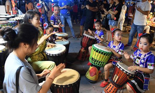 Children play drum with their parents at a night fair by the Lancang River in Jinghong City, Dai Autonomous Prefecture of Xishuangbanna, southwest China's Yunnan Province, May 31, 2019. After months of drought followed by rain, Jinghong of Xishuangbanna Dai Autonomous Prefecture looks glamorous. (Photo: Xinhua)