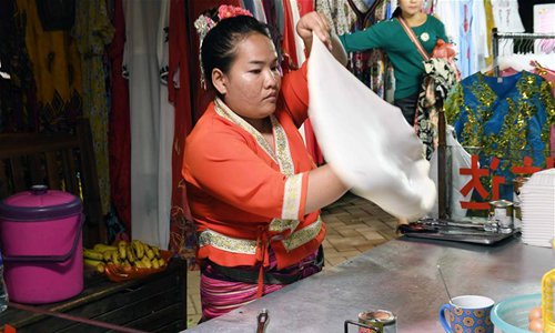 A woman makes pastry at a night fair by the Lancang River in Jinghong City, Dai Autonomous Prefecture of Xishuangbanna, southwest China's Yunnan Province, May 31, 2019. After months of drought followed by rain, Jinghong of Xishuangbanna Dai Autonomous Prefecture looks glamorous. (Photo: Xinhua)